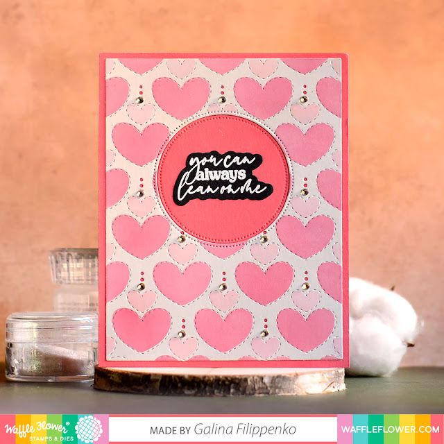And I used Quilted Hearts Coloring Stencil Duo without the panel die to create a background for my next two cards. I adore this pink and black combination! I cut out a big heart using Concentric Hearts Die from a black glitter cardstock and attached it on a piece of vellum.
